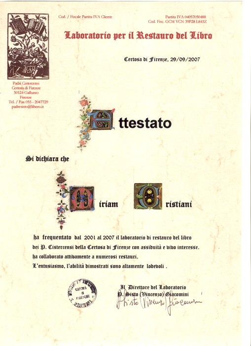 Miriam Elisabetta Cristiani lives and works in the Oltrepò Pavese hills. After graduating in Literature and Art History from the University of Pavia, her interest deepened in the world of art and antiques, first with an internship at the Sotheby's Auction House in Milan, and then with a stage at an artisan shop to learn the art of bookbinding and restoration of paper and books. She then began her apprenticeship in Voghera at the historic Bookbinding Crespi followed by later moving to Florence to be a student of Father Sisto Giacomini, an international renowned Cistercian monk at the Certosa del Galluzzo. After her years of apprenticeship, she opened at Torrazza Coste, a village in the Oltrepò Pavese, the studio that bears her name and where she devoted herself with great passion for the restoration of old books, prints, watercolors, drawings, manuscripts , maps, comic books, but also the binding of contemporary material, the production of works of cardboard and water coloring of prints. Her efforts for greater perfection in the workmanship has given way to other products, such as hand-dyeing of leathers and the creation of decorated wallpapers: all aimed at a restoration that is aesthetically impeccable and philologically correct.